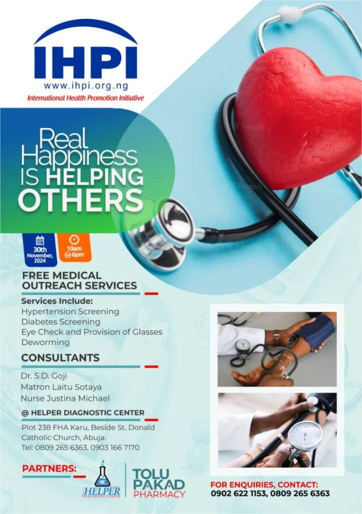 November 30th, 2024 10am – 6pm Free Medical Outreach Services – Hypertension screening, Diabetes screening, Eye check and provision of glasses, Deworming – Consultants – Dr. S.D. Goji, Matron Laitu Sotaya, Nurse Justina Michael @ HELPER Diagnostic Center, Abuja (Partners – HELPER Diagnostic Center, Tolu Pakad Pharmacy)