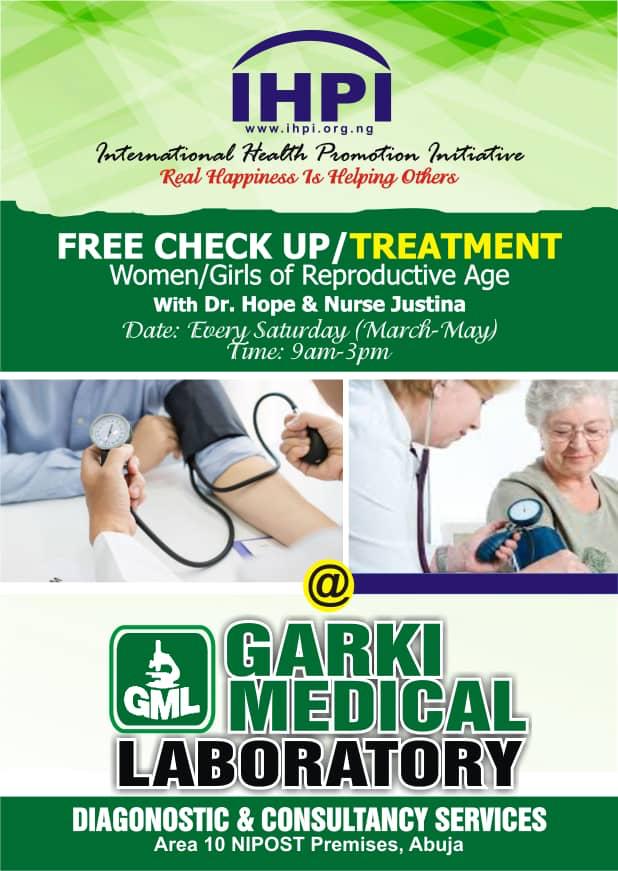 Free Medical Check-up and Treatment for Women and Girls of Reproductive Age with Dr. Hope and Nurse Justina, every Saturday March to May, 9am – 3pm at Garki Medical Laboratory, Abuja – 2021