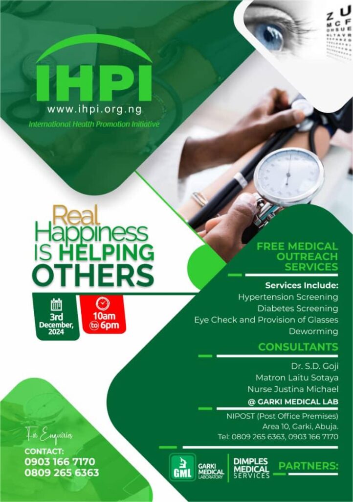 December 3rd, 2024 10am – 6pm – Free Medical Outreach Services – Hypertension screening, Diabetes screening, Eye check and provision of glasses, Deworming – Consultants – Dr. S.D. Goji, Matron Laitu Sotaya, Nurse Justina Michael @ Garki Medical Laboratory, Abuja (Partners – Garki Medical Laboratory, Dimples Medical Services)